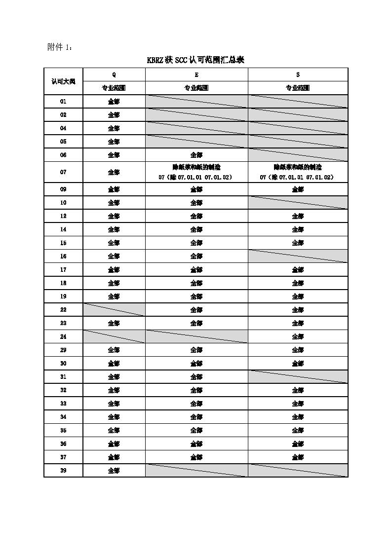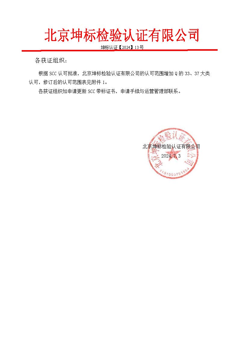 根據(jù)SCC認(rèn)可批準(zhǔn),北京坤標(biāo)檢驗(yàn)認(rèn)證有限公司的認(rèn)可范圍增加Q的33、37大類認(rèn)可,修訂后的認(rèn)可范圍表見附件1。